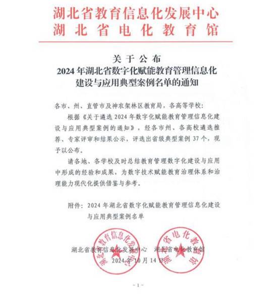 近日,湖北省教育信息化发展中心(湖北省电化教育馆)公布了2024年湖北省教育信息化优秀案例名单。我校申报的《襄阳职业技术学院数字赋能,创建“4+数字化转型”标杆校》在众多案例中脱颖而出,成功入选2024年湖北省教育信息化省级优秀省级案例。